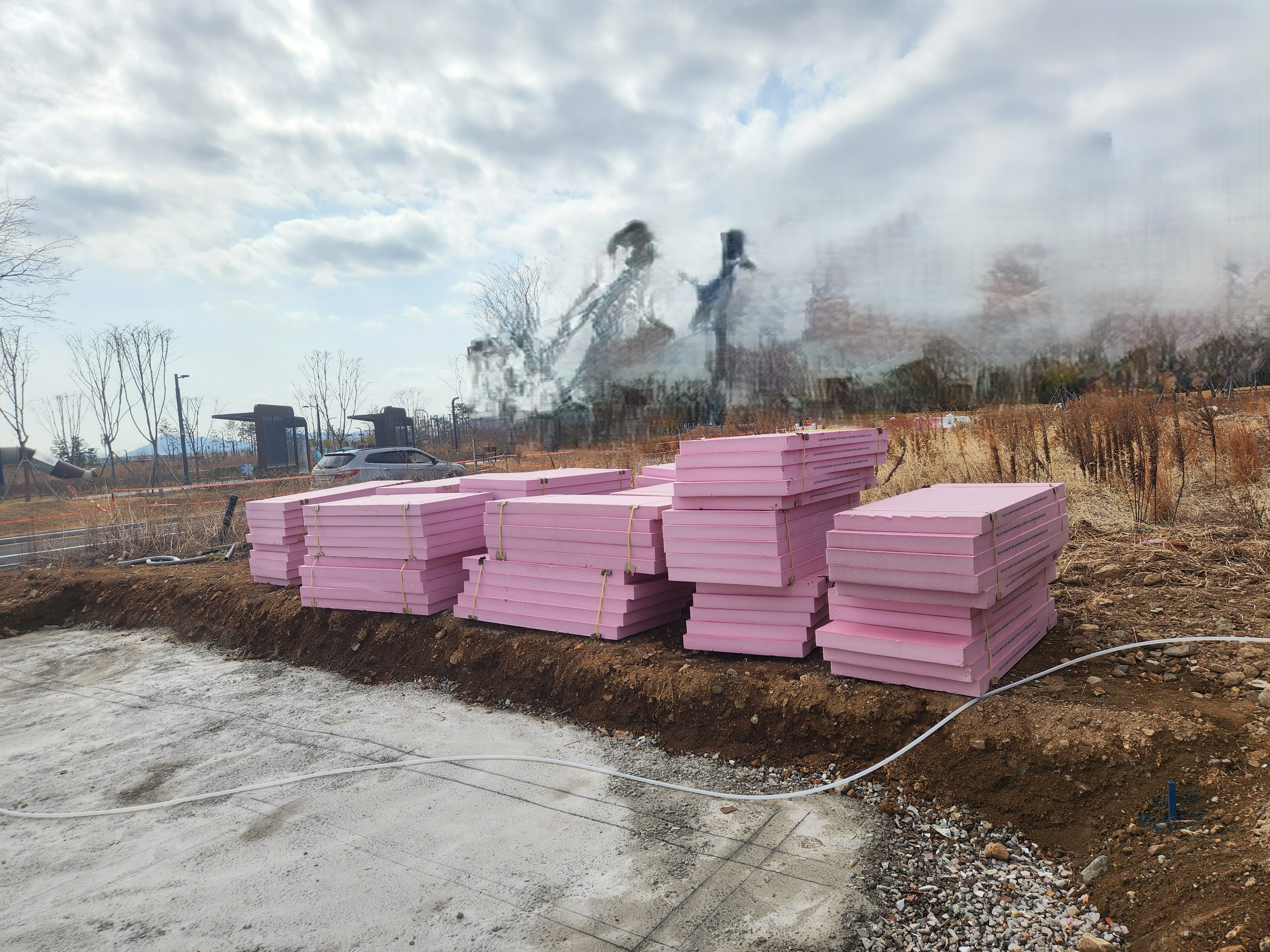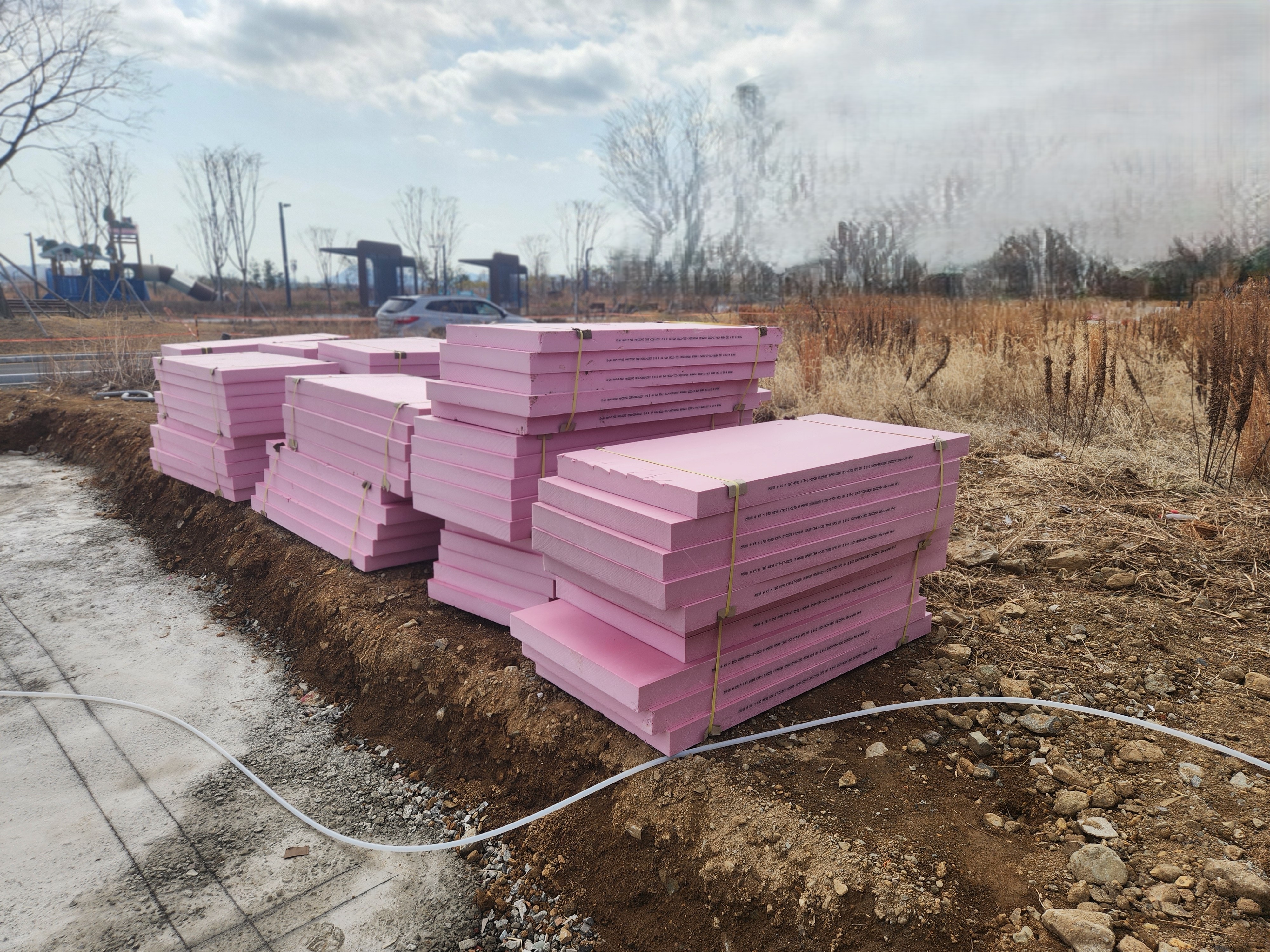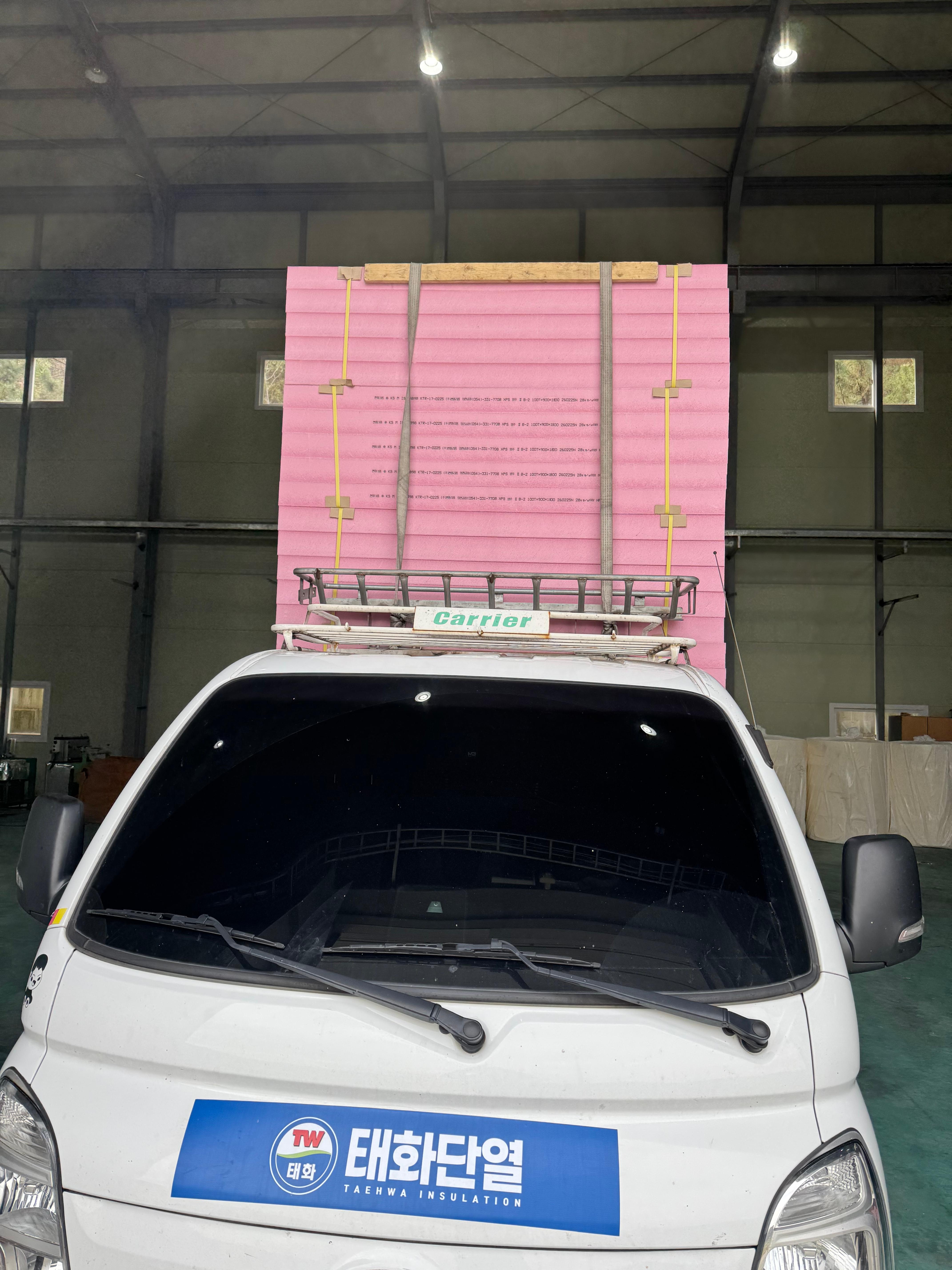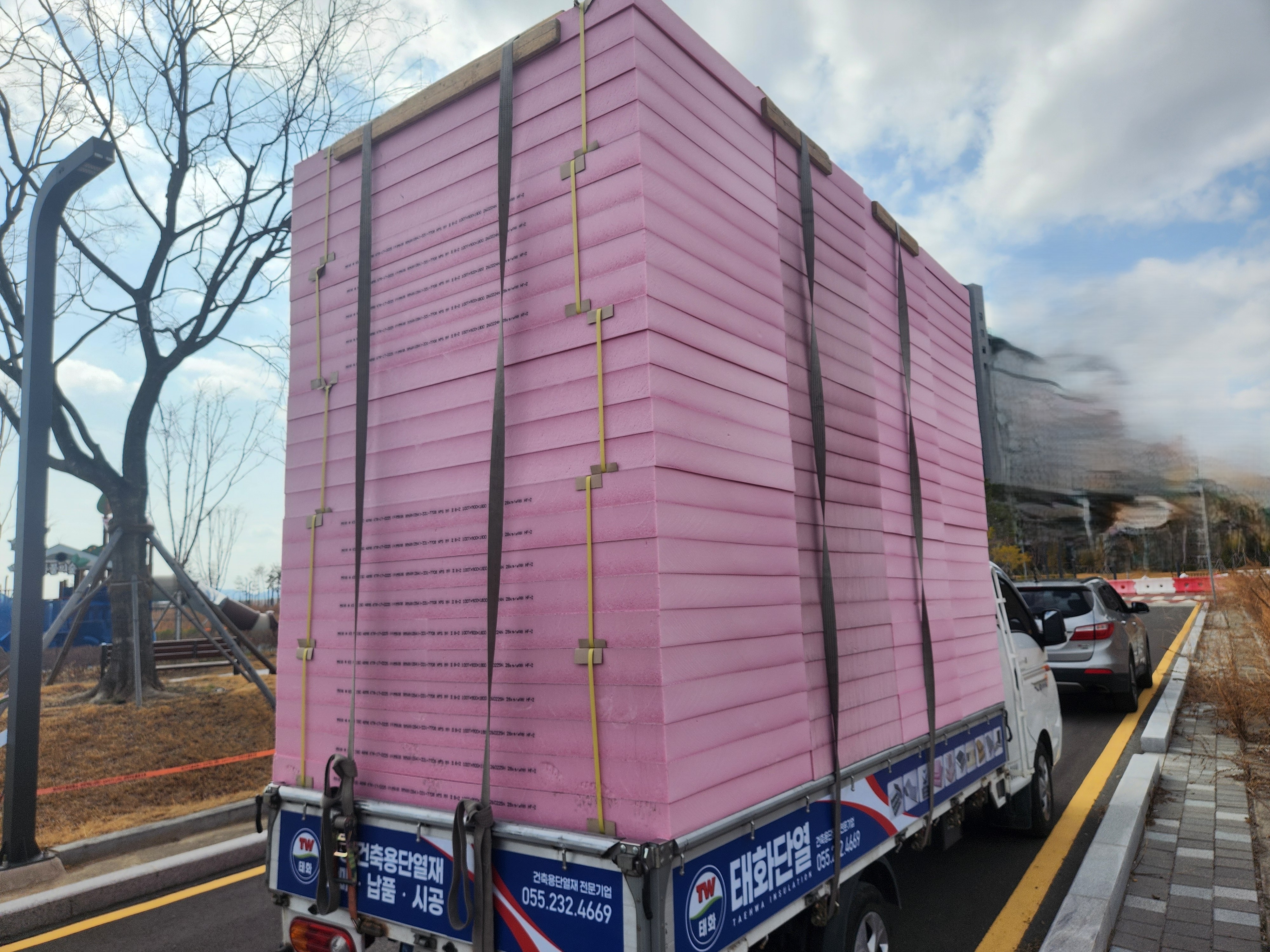 핑크색 압출법 단열재를 대량 상차한 뒤